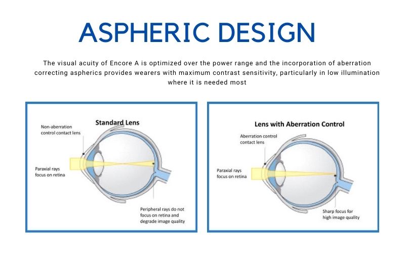 Aberration Correcting Aspheric (LEFT) Design – Creates less ring (ACA) Design with its Special Large pressure on eye and allows less Diameter Design – Provides wearers interactions between the eye lids with maximum contrast sensitivity and the lens – providing extreme particularly in low illumination comfort to wearer and easy adaption environment and much stable, to first time wearers. clearer, wider & sharper vision zone.